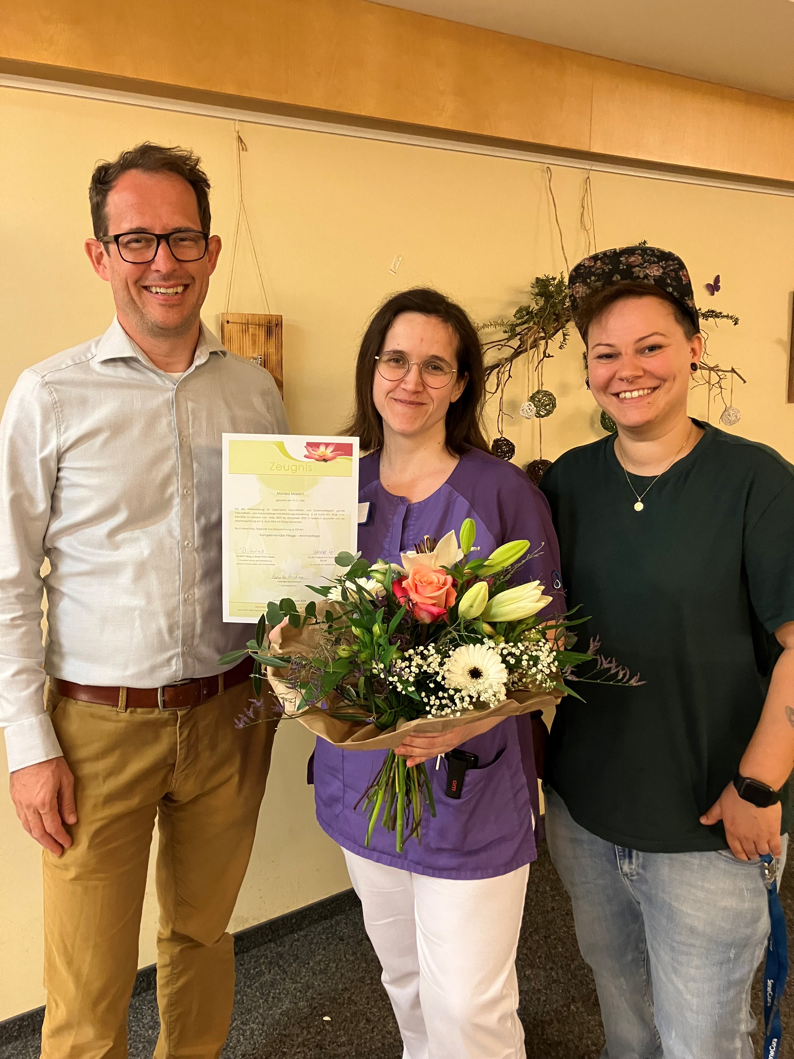 „Die Aromapflege ist in Herrenried ein essentieller Bestandteil in der täglichen Pflege und Betreuung unserer Bewohner:innen und die stetige Fort- und Weiterbildung unserer Mitarbeiter:innen ist uns sehr wichtig. Wir gratulieren Monika von Herzen zum bestandenen Abschluss.“, so PDL Melanie Stemer.